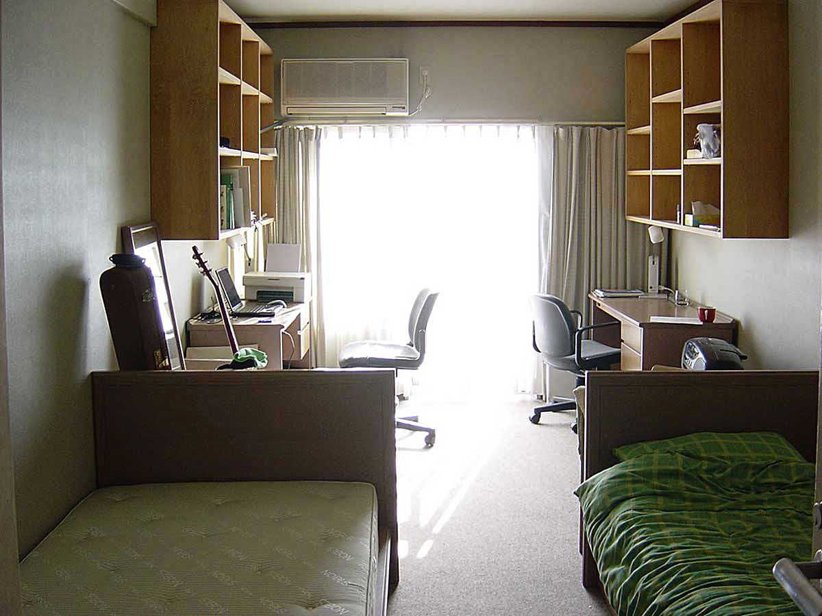 本館正門と向き合うようにして道路を挟んで、すっきりとした木造スレート拭きの2階建てがあります。既婚者のための家族寮と講師などのゲストハウスとして、移転時に新築されました。家族寮スペースは2LDKでお子さんが小さな家族には十分な広さが確保されています。エアコンやバストイレ、納戸は備えられていますが、家電製品などは各自で準備していただきます。